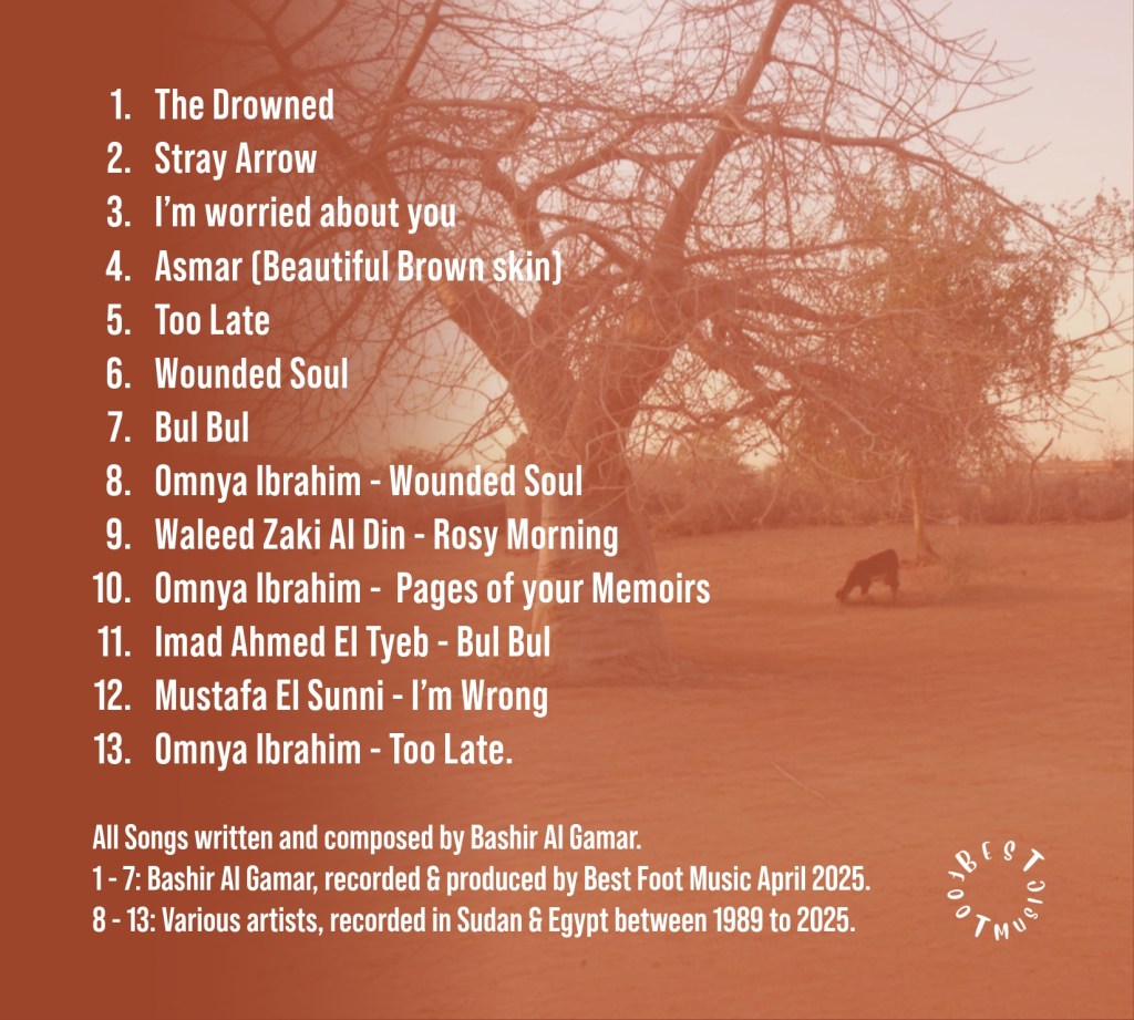 Bashir has been playing Oud since his teenage years, he composed his first song in 1989 (there is a new recording of this on the album called ‘Bul Bul’, a type of bird). In early 1990’s he was pulled off stage, during a concert by the Sudanese regime, who imprisoned and tortured him, believing his music was critical of the regime. He managed to escape to the UK with his family and has lived in Brighton since 1993, where he has become a much loved musician and part of the community. His songs are highly regarded by other Sudanese musicians, many of who have recorded versions of them. This album features brand new studio recordings with Bashir, made in the music studios at Northbrook College, in Worthing and a collection of his songs as recorded by other Sudanese artists. Due to the complete destruction of infrastructure in Sudan, the only way artists could contribute songs was to send them via WhatsApp and for us to remaster them in the UK. While there is some slight sound degradation, this reflects on some of the realities of the situations faced by people having to flee conflict. Much of this music has not been released in the UK before and we’re really excited about people being to hear it, while supporting people affected by the war in Sudan.